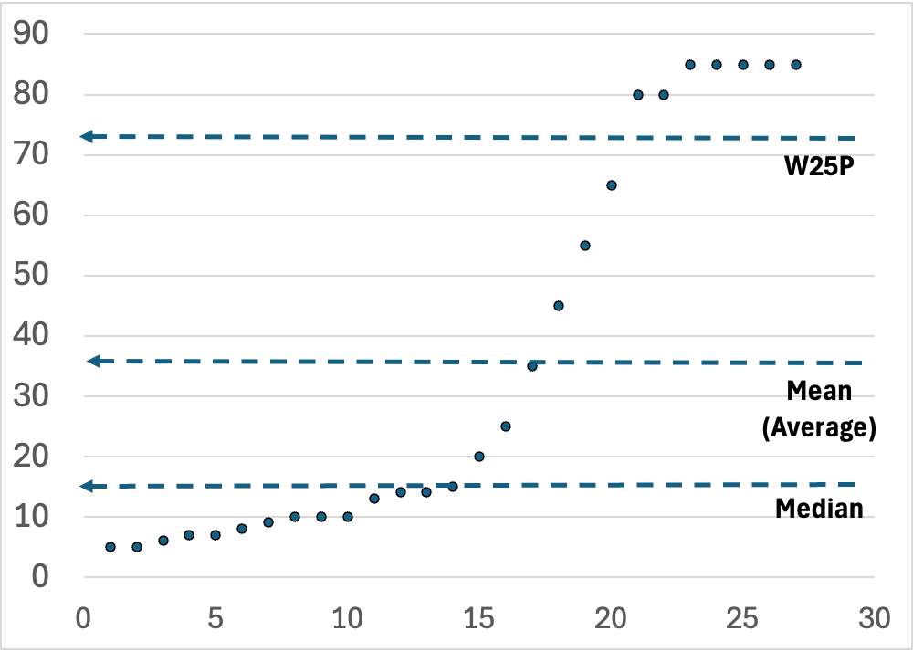 Throughout my professional life, I have performed analyses to assess performance related to some process or function. Whether it’s the performance of people processes, machine processes, or something else, I have found a simple metric (or set of similar metrics) that seems very often to tell me the first thing I need to know and track. That is the “worst [x] percentile.” To make this less cumbersome to write, let’s call it the “WXP.” And, if referring to a specific percentile, let’s substitute that percentile in for “X” (e.g., W25P for the worst 25th percentile).